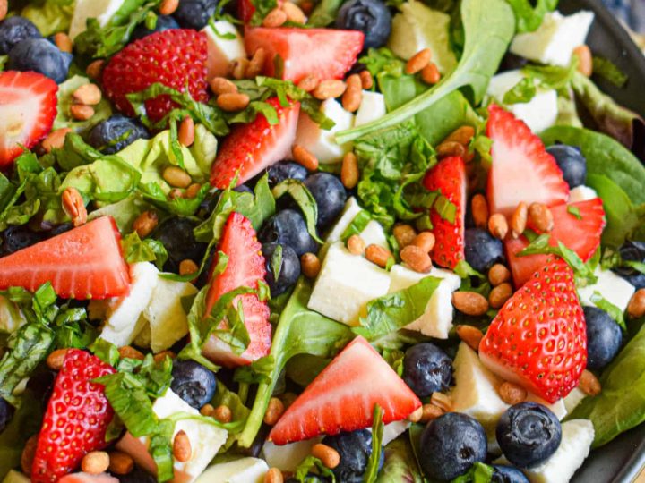 This fresh and delicious salad combines strawberries, blueberries, and mozzarella cheese for a red, white, and blue side dish perfect for Patriotic celebrations. Topped with toasted pine nuts, fresh basil, and balsamic vinaigrette.