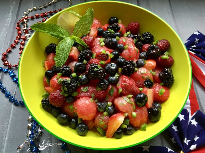 Jalapeno Lime Summer Fruit Salad is an easy fruit salad recipe that's bursting with sweet juicy berries and watermelon, fresh mint, zesty lime and a hint of jalapeno heat.