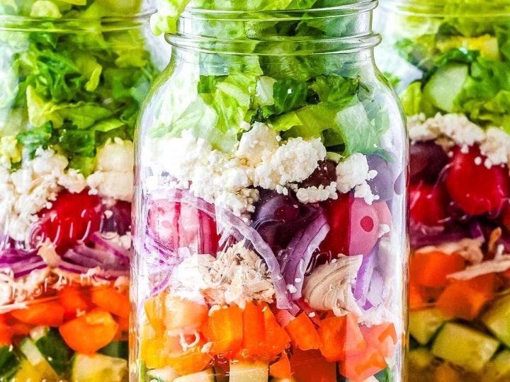 This Salad is layered with crisp cucumbers, juicy cherry tomatoes, tangy red onions, kalamata olives, feta cheese, and a light Greek vinaigrette, this Mason Jar Greek Salad is a vibrant, healthy meal prep option.