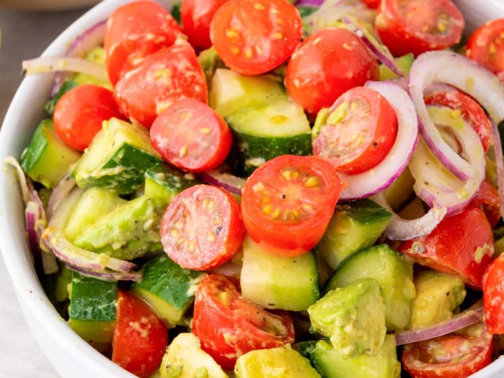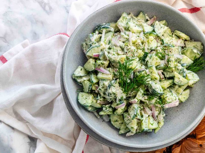 This Greek inspired fresh cucumber salad with Tzatziki salad dressing is light and refreshing, the perfect summer side dish. Serve with pasta, sandwiches, as part of a grain bowl, or on the side of a grilled main dish.