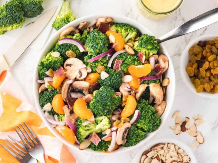 This Broccoli Salad is full of fresh, vibrant broccoli, raisins, sliced almonds, mushrooms and sweet mandarin oranges topped with a sweet, creamy dressing. A perfect summer salad that is both hearty and filling.