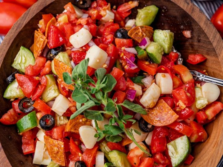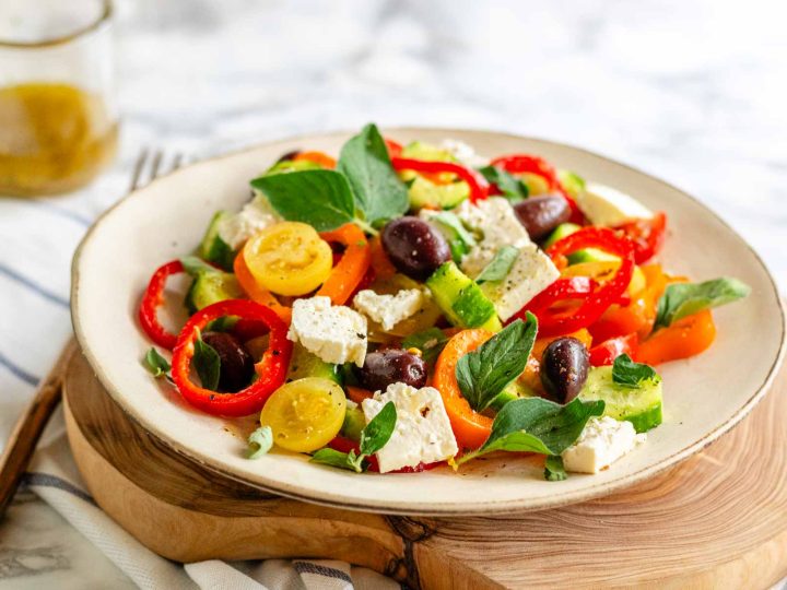 This refreshing, easy Greek salad recipe is the perfect side dish, with Mediterranean flavors, crisp vegetables, and a simple dressing.