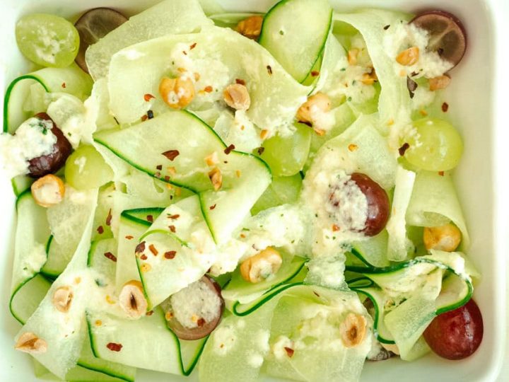 This cucumber melon salad with melon vinaigrette is a summer salad with a subtle sweet citrus flavor that's super light, refreshing and easy to make on a hot summer day. Ribbons of honeydew melon, cucumber and a pop of fresh mint and lemon.