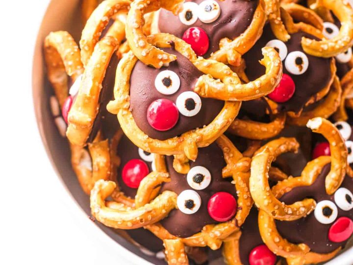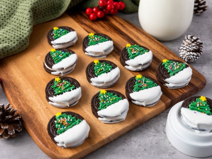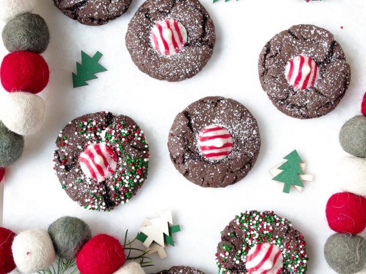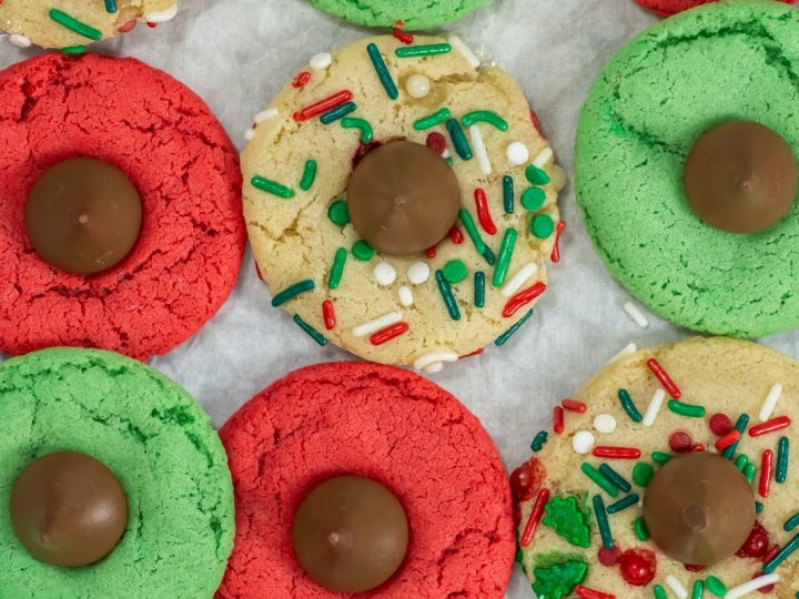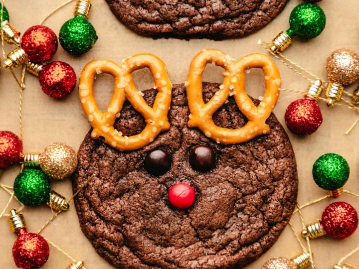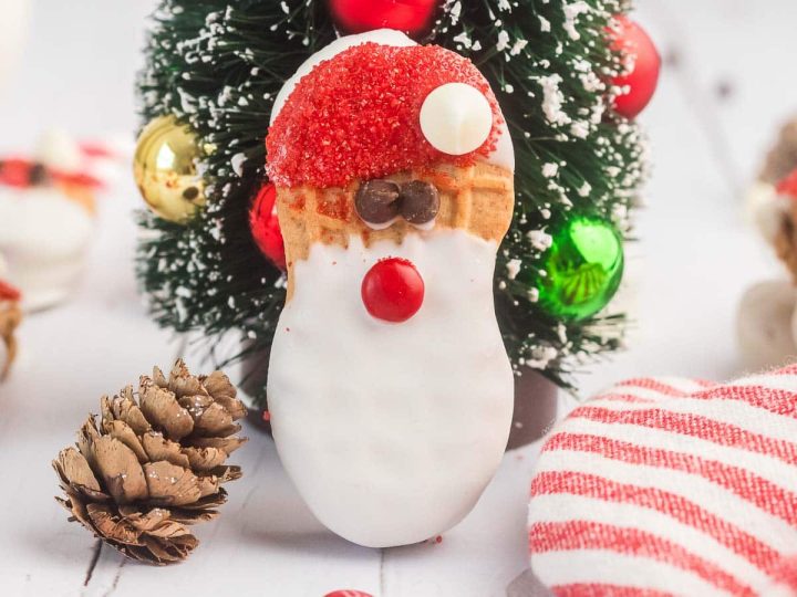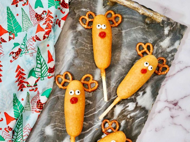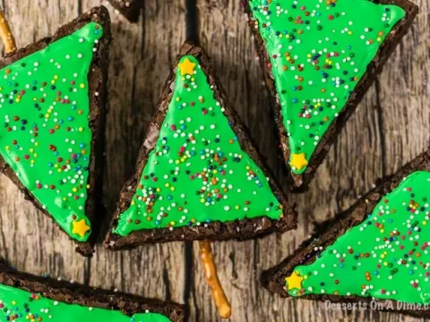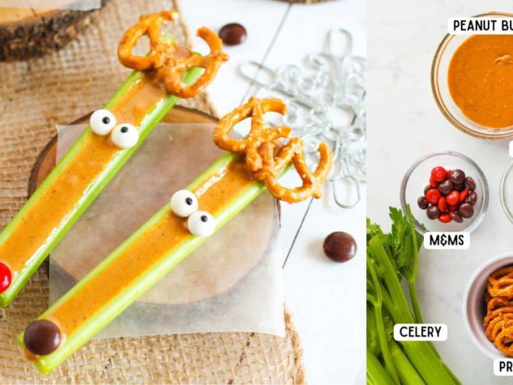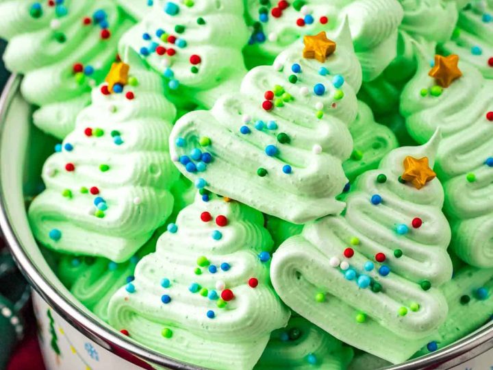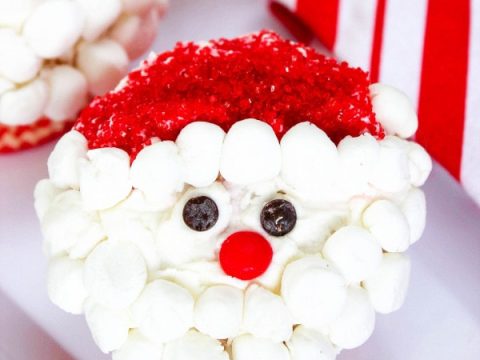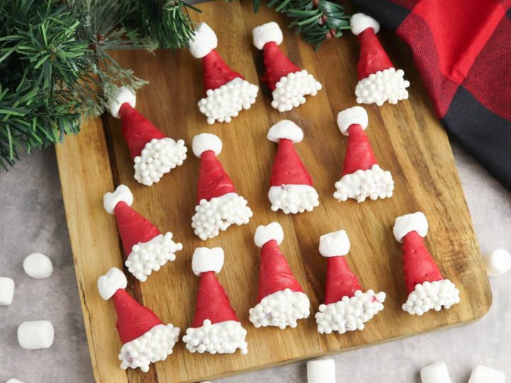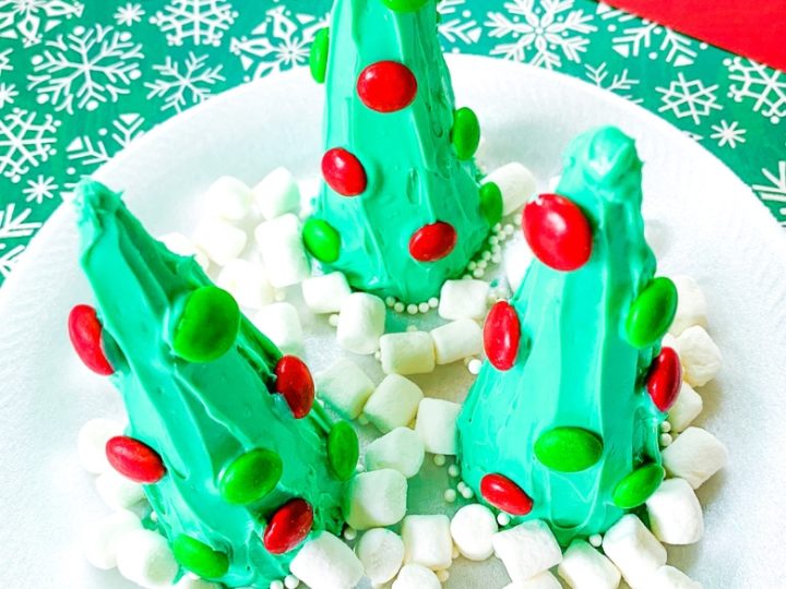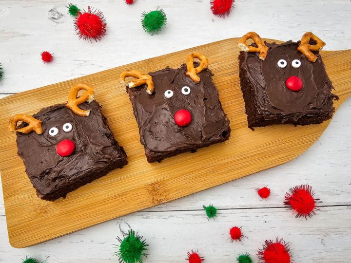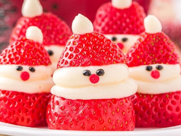 A collage of Christmas treats for kids: meringue trees, reindeer brownies, tree cupcakes, strawberry Santas, snowmen, and thumbprint cookies.