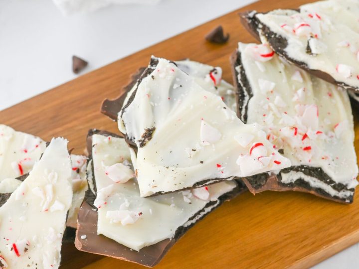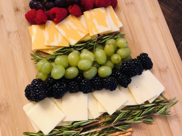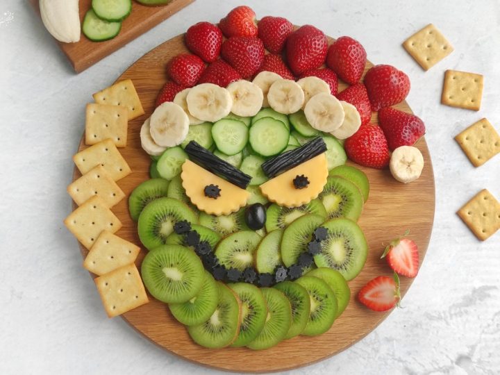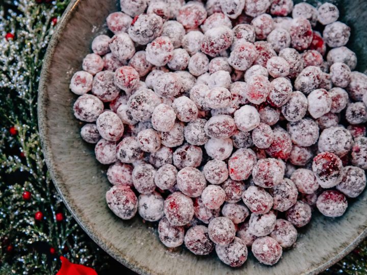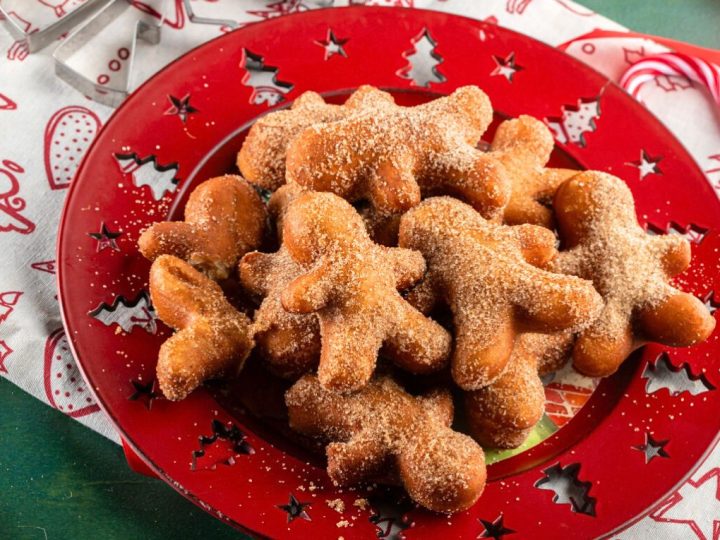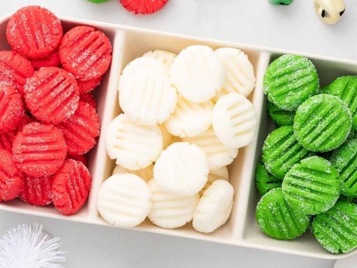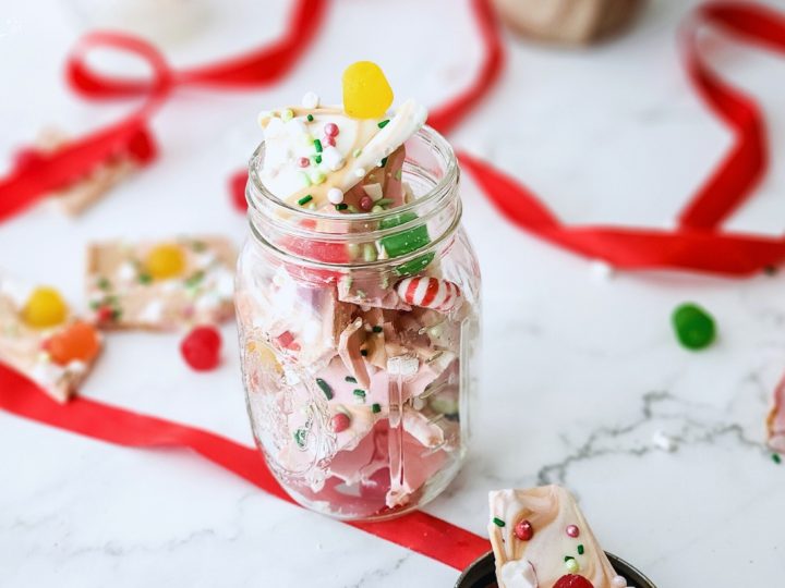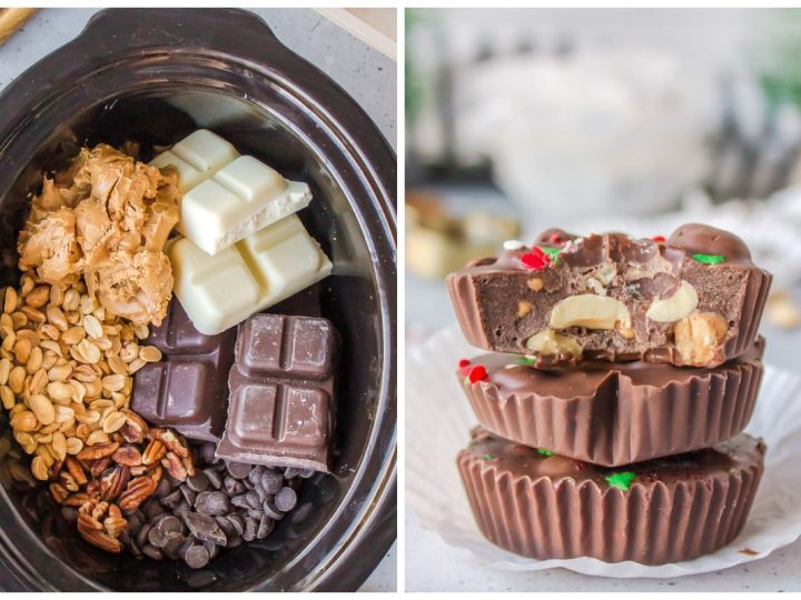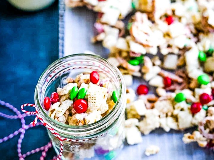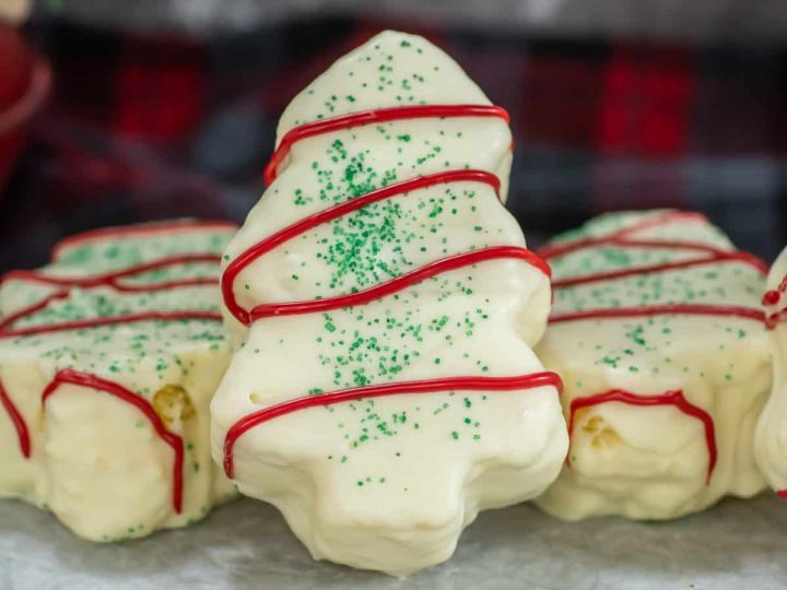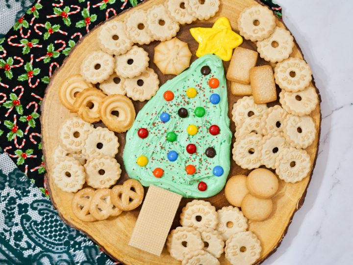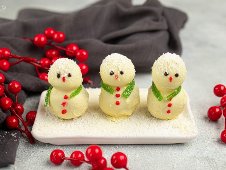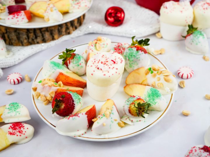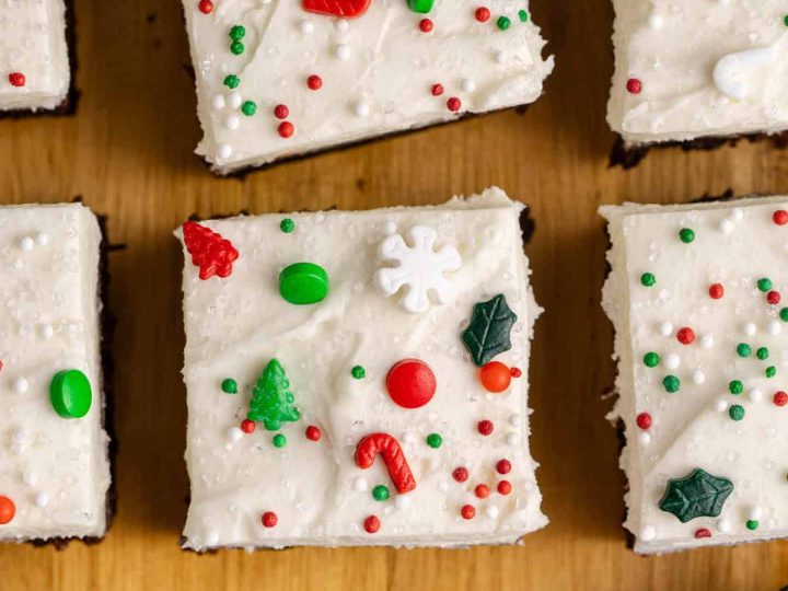 A collage of Christmas treats for kids: meringue trees, reindeer brownies, tree cupcakes, strawberry Santas, snowmen, and thumbprint cookies.