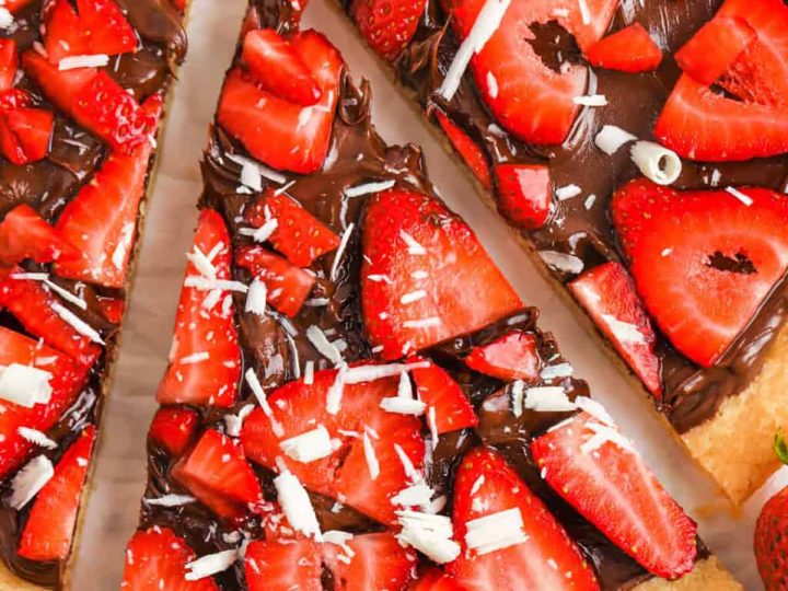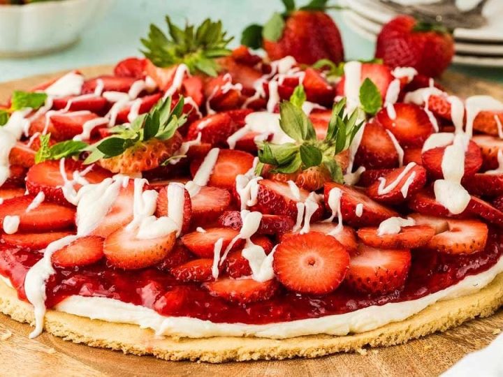 Strawberry pizza is a delicious dessert that combines a soft sugar cookie crust, a luscious cream cheese layer and a vibrant strawberry topping for the perfect balance of sweetness and freshness.