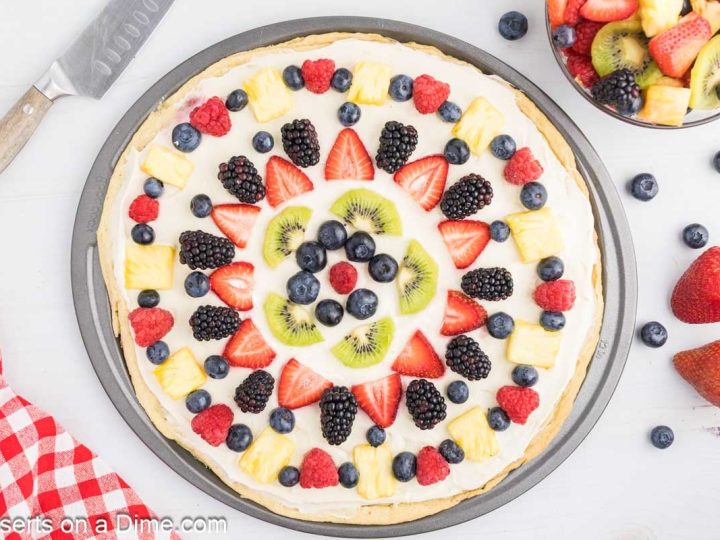 Easy Fruit Pizza is the best summer dessert. Sweet juicy berries with a citrus cream cheese filling spread over a sugar cookie crust. It’s all topped with a rainbow of fruits for a beautiful dessert.