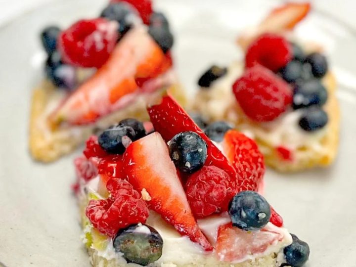 A mini sourdough fruit pizza is by far my favorite birthday treat and summer dessert. This recipe is wholesome, simple, and irresistible. The crust is a sourdough sugar cookie, the cream cheese is pure with honey whipped in, and the berries are seasonal.