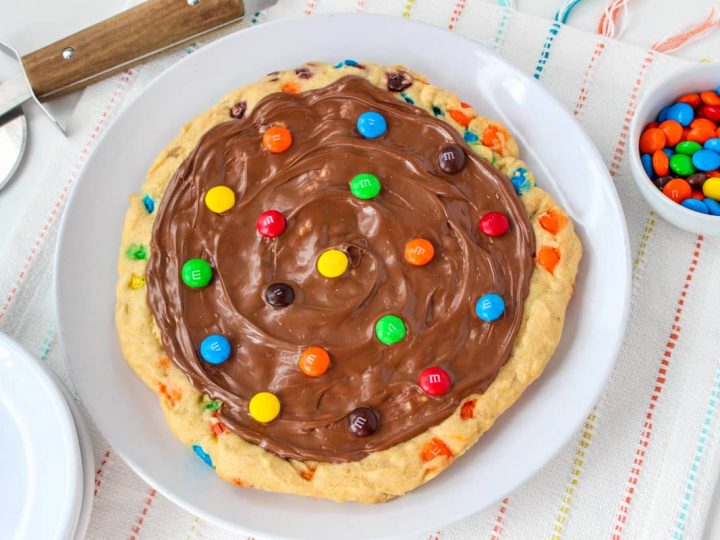 M&M cookie pizza is a colorful and sweet skillet cookie recipe that is perfect for sharing with a crowd. A chewy cookie base is topped with melted chocolate and colorful M&M candies, then sliced into shareable triangles to create this gooey and rich dessert pizza.