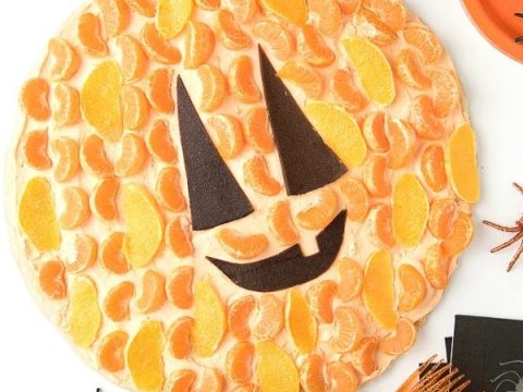 This festive treat starts with a soft sugar cookie crust, a creamy sweet topping, and layers of fresh fruit arranged in the shape of a pumpkin face. Kids and adults will love this light, colorful alternative to traditional Halloween candy.