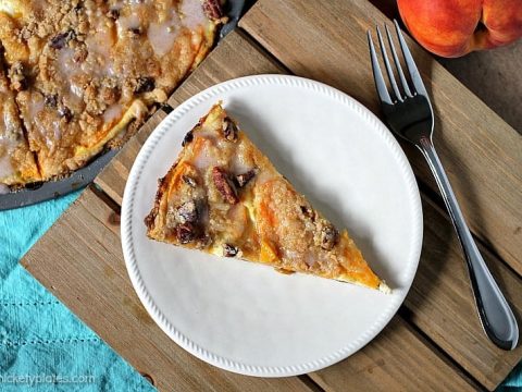 Peach Crumble Fruit Pizza is made on a cake batter crust, piled with thinly sliced fresh peaches, topped with a crumble and pecans and drizzled with a cinnamon sugar glaze.