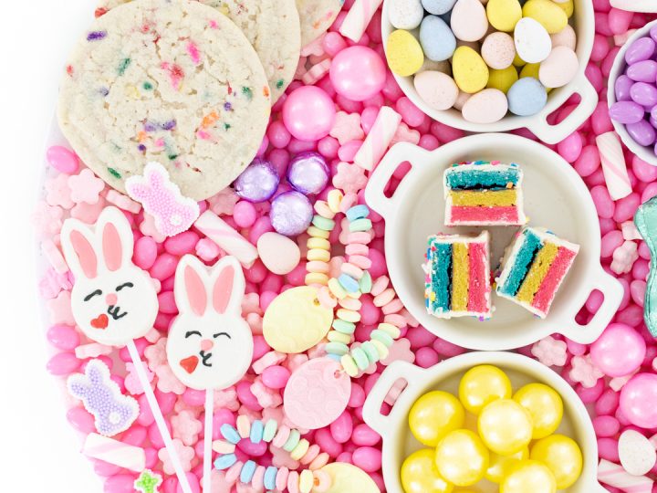 Another great option is to accent the sweets with a fun decoration/dip. Make an Easter bunny from buttercream frosting and load the board with treats that are perfect for dipping.