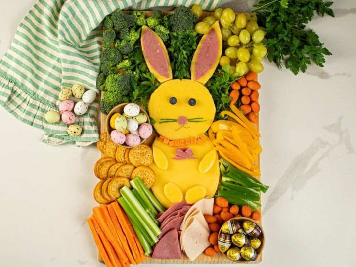 This Easter board idea has a little of everything: some meats, veggies, a little candy, and crackers. But the real star is the Easter bunny made entirely from cheese.