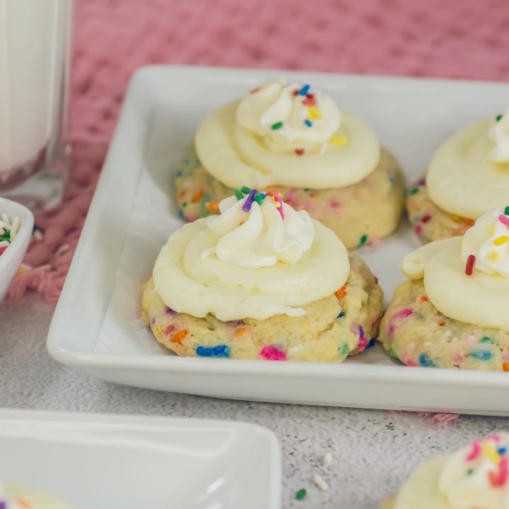 Inspired by classic birthday cake flavors, these Funfetti Milkshake Cookies are thick, chewy, and bursting with colorful sprinkles. A fluffy frosting and whipped cream topping make them extra festive and perfect for parties, celebrations, or anytime you want a little nostalgia.