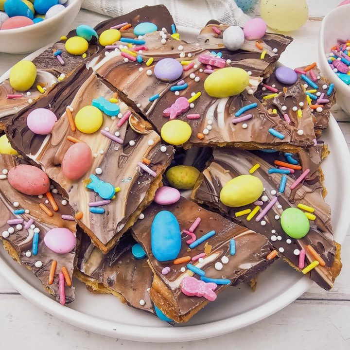 With beautiful pastel-colored swirls, Easter sprinkles, a yummy white chocolate topping, and added crispy crunch from the brown sugar-coated saltines, this is a perfect indulgent Easter treat!