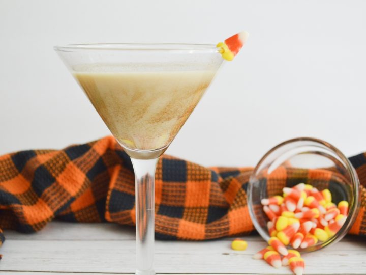 Here’s a tasty martini that blends perfectly with the flavors of Thanksgiving. Vanilla and coffee liquors are the ideal vehicle for a little pumpkin spice seasoning, complete with a candy corn garnish.
