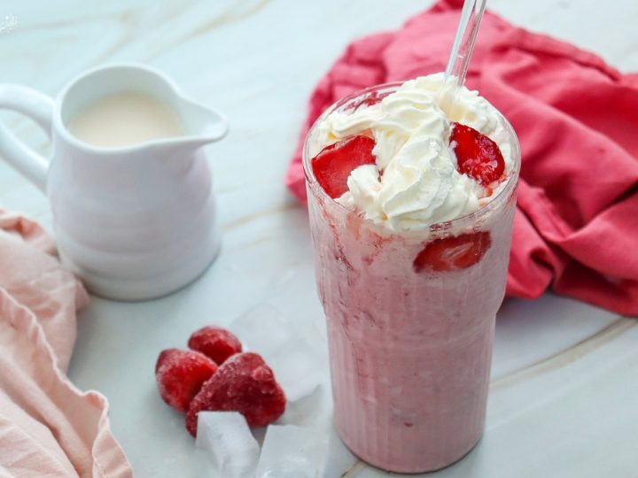 Strawberry Cheesecake Frappuccino is a creamy, fruity drink perfect for little guest gatherings. Frozen strawberries, Greek yogurt, and a touch of cream cheese blend into a frosty, sweet beverage, topped with whipped cream and fresh strawberries for a playful, dessert-like treat.
