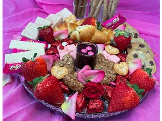 Load up on the sweet treats with this pinktastic Galentines charcuterie masterpiece. While it’s covered in sweet pink glory, the standout has to be the special pink fortune cookies.