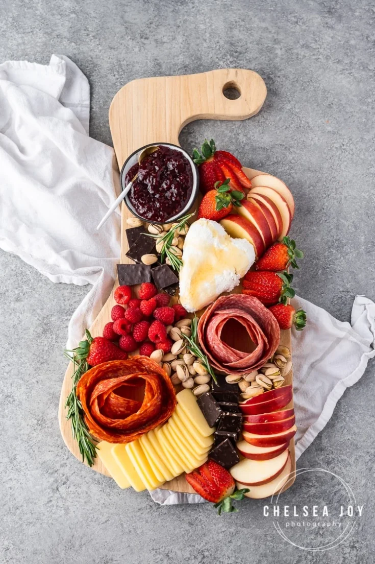 Here’s another option that offers sweet and savory flavors, but with a twist. The heart-shaped bowl of chocolate fruit dip in the middle really elevates the whole thing.