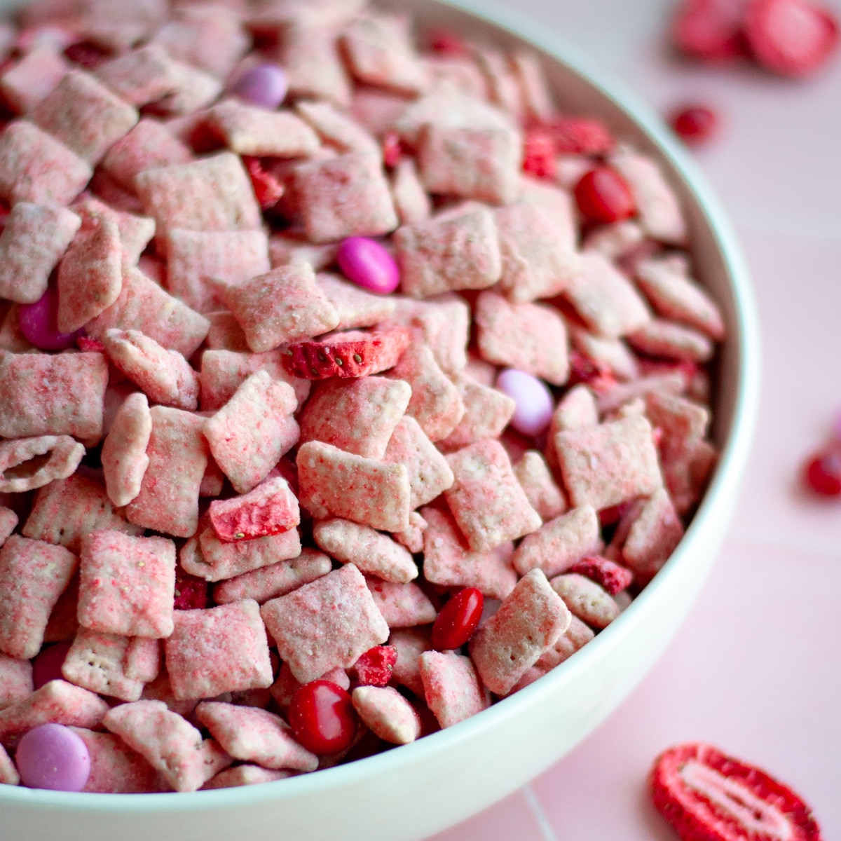 Sometimes all that arranging is a bit too much work, though. For a simpler solution on Galentines snacks, this strawberry puppy chow can be made ahead of time and put out in a hurry.