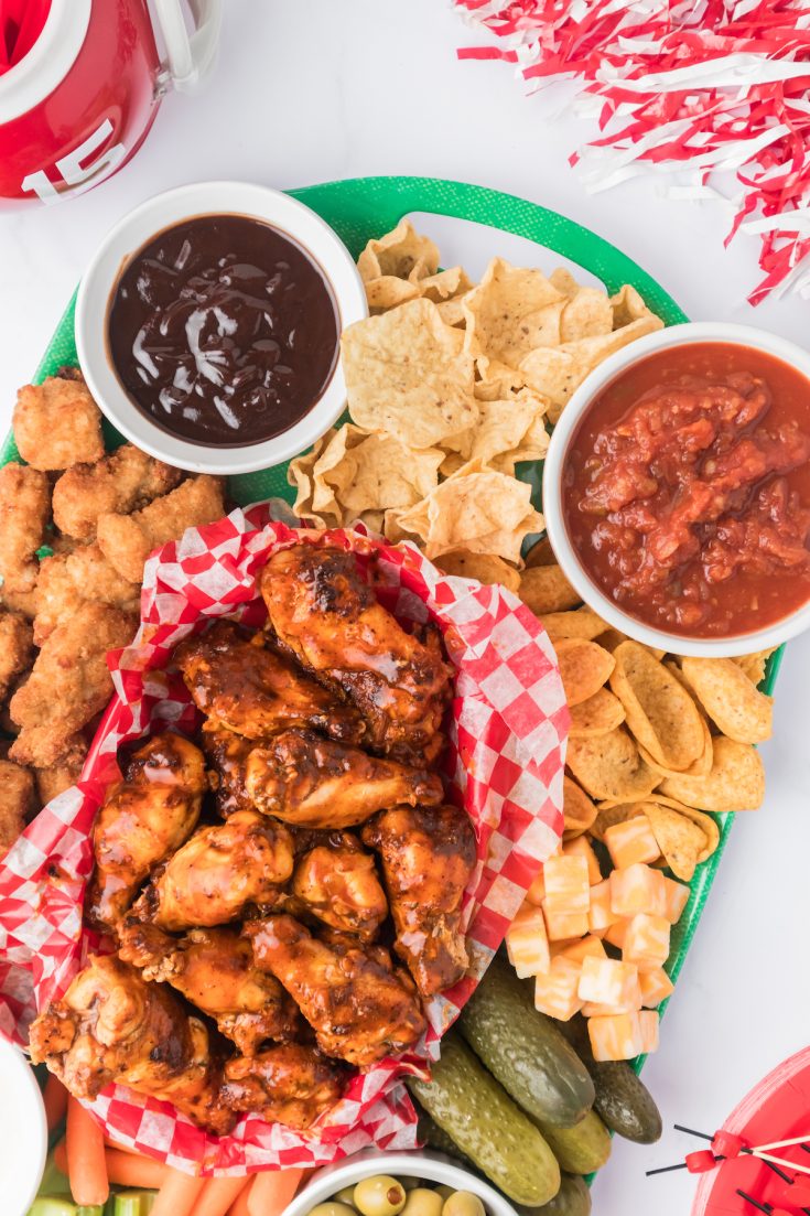 The cows would be so proud of this next option. It’s packed with wings, tenders, chicken of all shapes and sizes, plus enough dipping options for everyone.