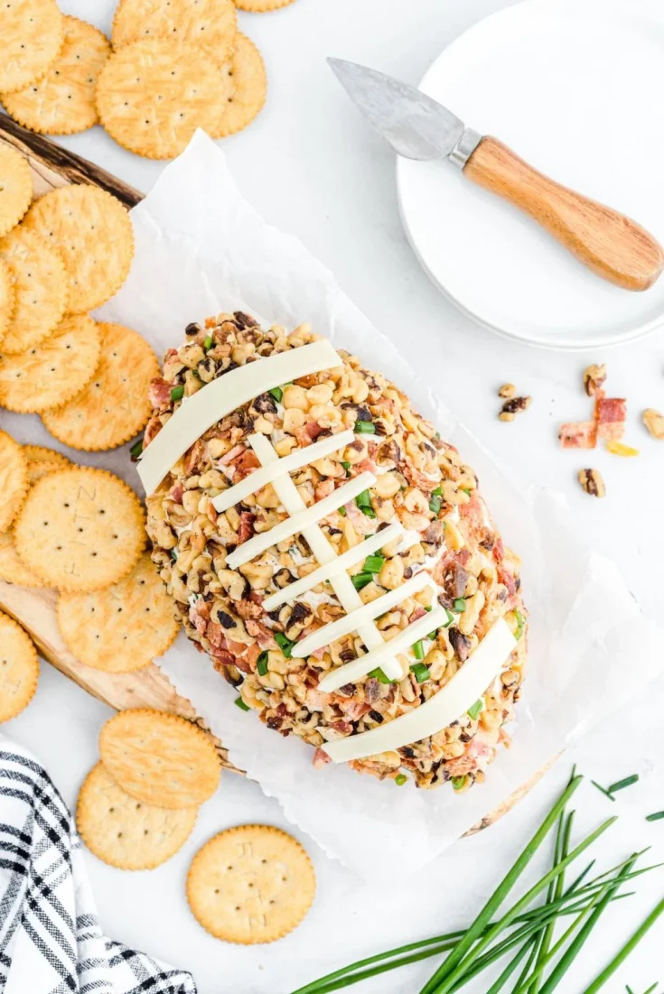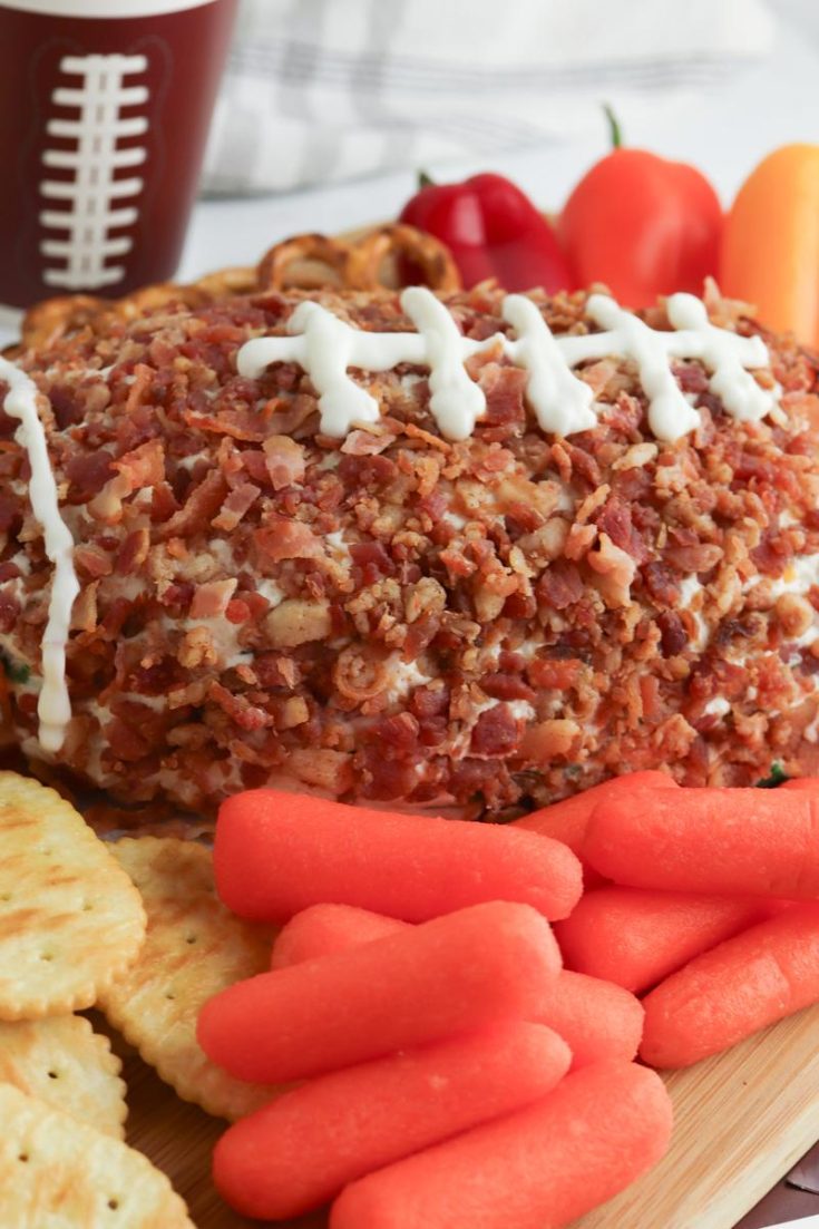 Another fantastic centerpiece to a game day charcuterie board is the perfect cheese ball. This handmade, bacon-coated football will grab guests’ attention for sure.