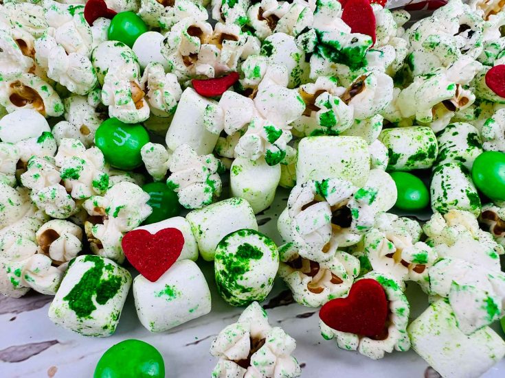 This Grinch popcorn is a salty sweet treat that kids will love. The pops of color throughout make this look so appealing.