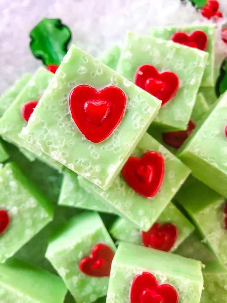 Nothing beats fudge in terms of comfort food, and winter is the ultimate comfort food season. This beautiful green Grinch fudge is accented by sparkly sugar crystals for a glittery crunch in every bite.
