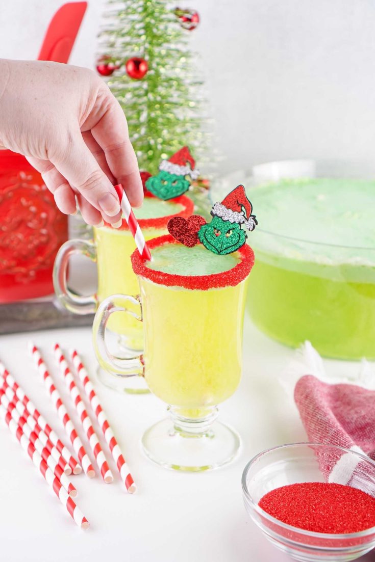 Here’s another approach to Grinch punch with a surprise ingredient; pineapple juice! The red sugar-rimmed glasses give this the perfect visual flair.