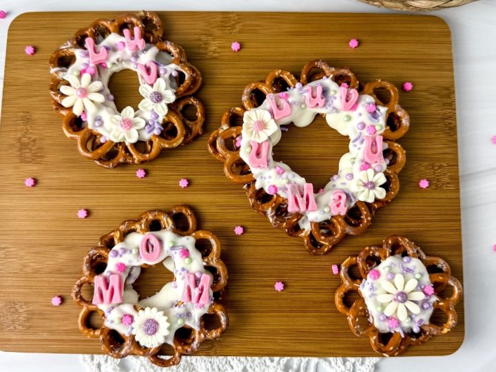 This chocolate-drizzled pretzel wreath decorated with candy flowers and sprinkles is as fun to make as it is to gift, and Mom is going to absolutely adore it! Sweet, salty, and made with love, it's the kind of homemade treat that means more than anything from a store!