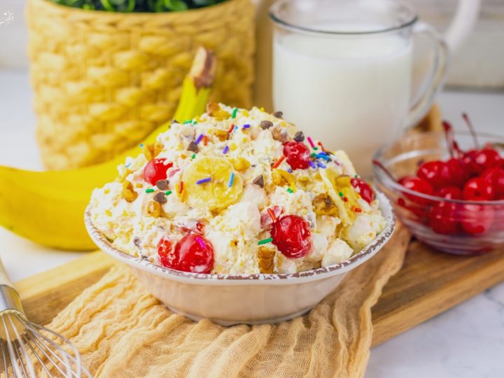 Banana Split Fluff is a fun, fruity dessert packed with cherries, pineapple, and banana flavor, finished with a fluffy whipped base and colorful sprinkles.