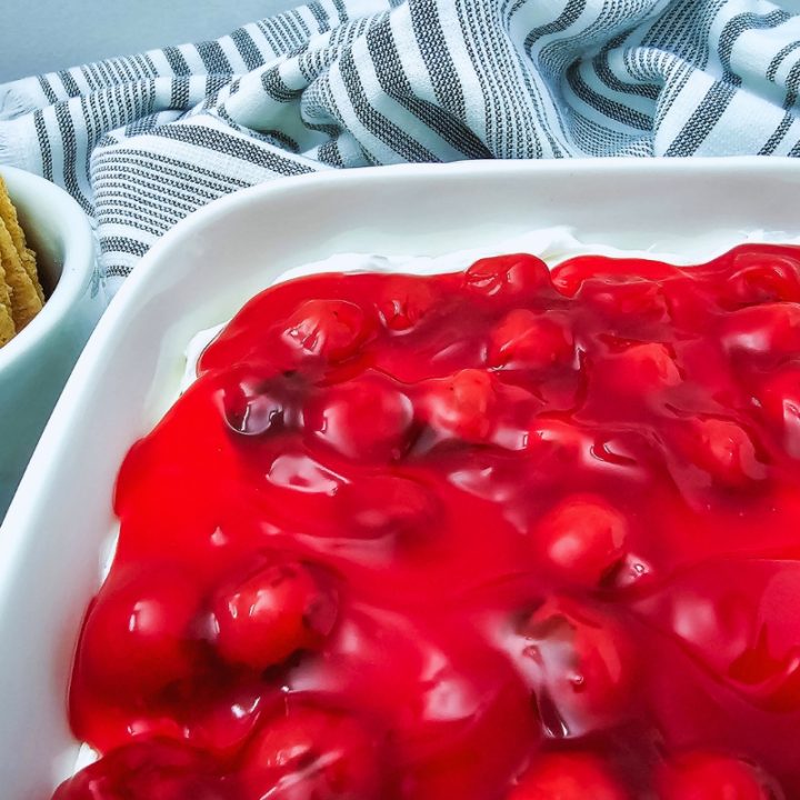 This 4-ingredient Cherry Cheesecake Dip is a rich, creamy no-bake treat topped with sweet cherry pie filling. All the classic cheesecake flavor in an easy, scoopable dip!