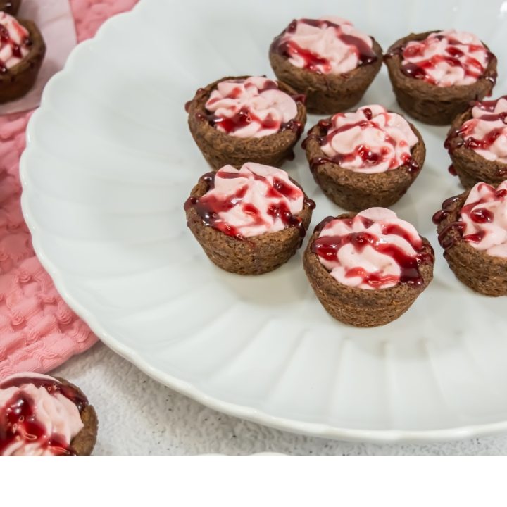 Fudgy brownie cups filled with light, creamy raspberry mousse make these bites the perfect mix of rich and fruity. A sweet, elegant treat for parties or gifting.