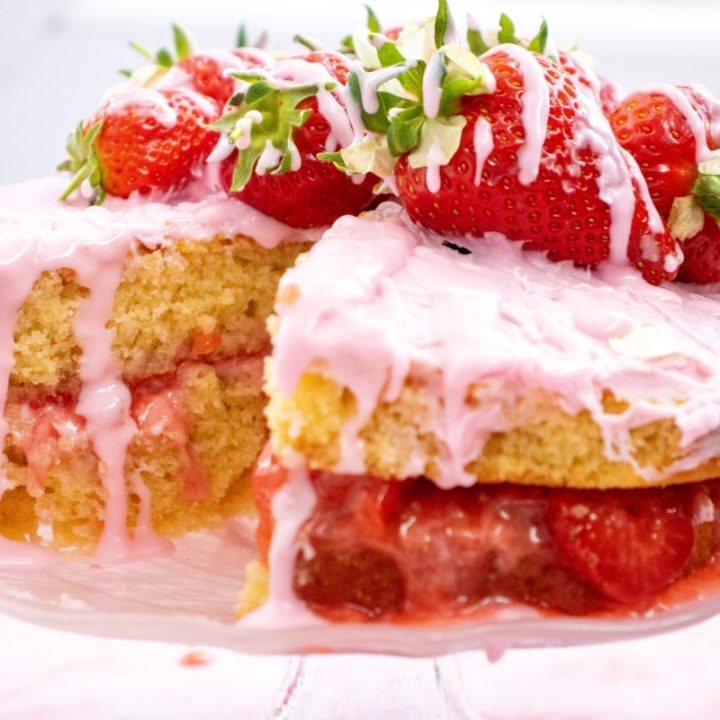 Tender vanilla cake meets bright, juicy strawberry filling in this simple, elegant dessert. A beautiful, delicious cake that’s sure to impress!