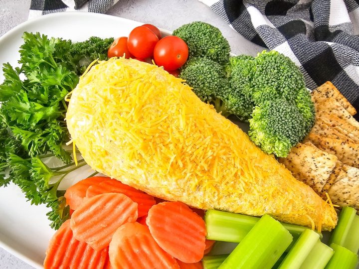 This Chick Cheese Ball combines creamy cheese, ranch seasoning, and bacon, then gets rolled in cheddar for a fun, savory appetizer. Decorated with carrots, olives, and crackers, it’s a playful vegetarian-friendly snack to serve with veggies, pretzels, or crackers!